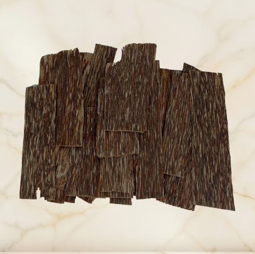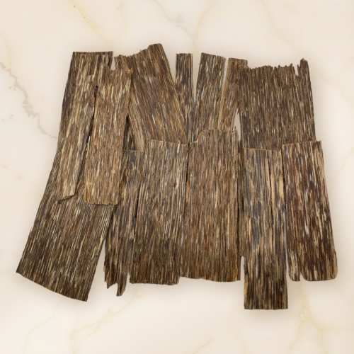 رقائق عود فيتنامي طبيعي هي قطع خشب أكويلاريا مليانة راتنج عطري داكنة وثقيلة تحترق ببطء وتطلق رائحة قوية وثابتة للمكان.